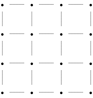16개의 점이 아래와 같이 놓여 있다. 점선으로 이은 두 점 사이의 거리가 모두 같다고 할 때, 서로 다른 세 개의 점으로 만들 수 있는 직각 이등변삼각형의 개수는 모두 몇 개인가?