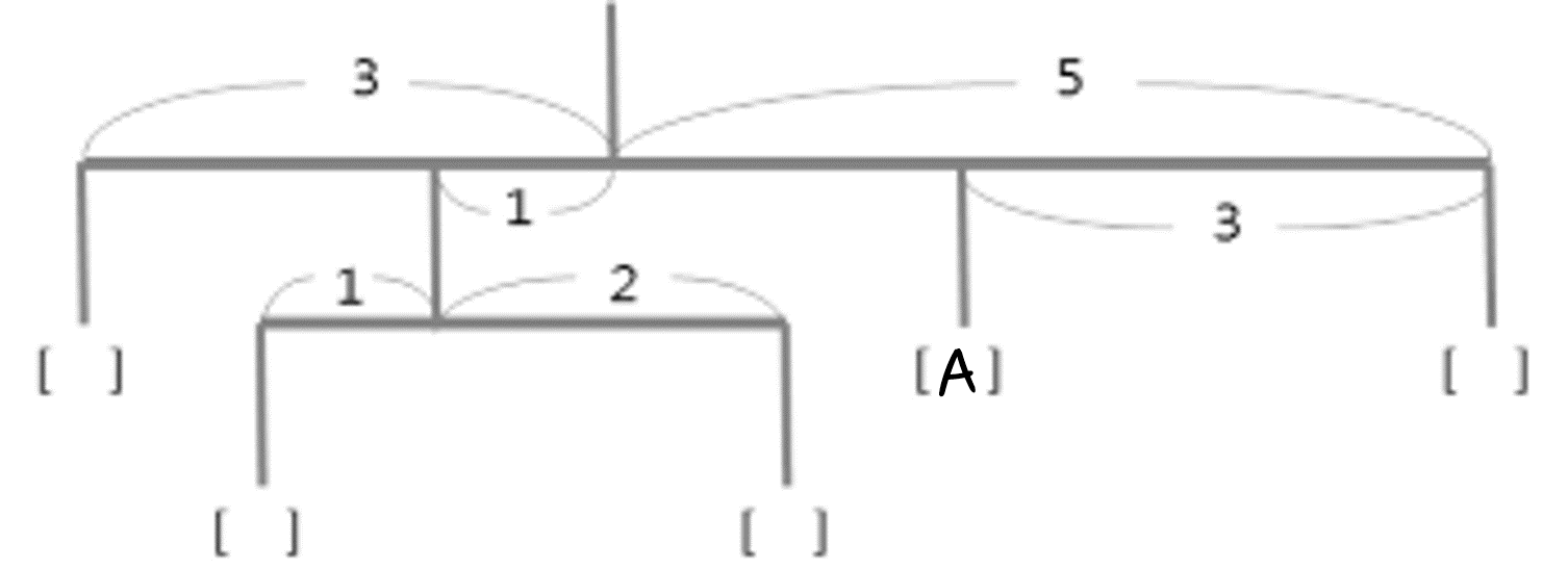 아래 그림과 같은 모빌에 무게가 각각 1, 2, 3, 4, 5 그램인 5개의 추를 달아서 균형을 유지하고 있다. A로 표시된 위치에 달린 추의 무게는?
